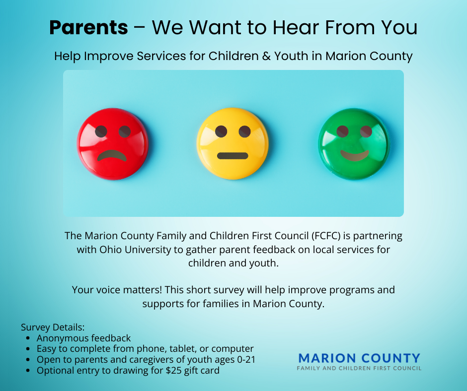 The Marion County Family and Children First Council is partnering with Ohio University to gather feedback on local services for children and youth. Your input will help improve programs and supports for families in our community.