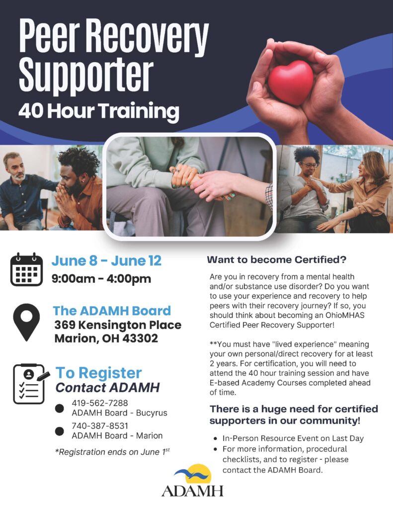 Are you (or someone you know) interested in becoming a Peer Recovery Supporter? Peer Support workers are people who have been successful in the recovery process who help others experiencing similar situations. If you have any questions or would like register, please contact Paula Brown at (740) 387-8531 or (419) 562-7288.